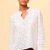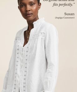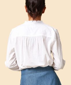 Our best-selling Carrie Blouse is the perfect style to see you through all seasons; the frill collar and cuffs make for gorgeous layering under knits. Made from 100% organic cotton dobby, Carrie has a button-through front, framed with lace and full length sleeves. Pretty pintucks at the yolk and cuffs add to the femininity of this v-neck, pretty blouse.