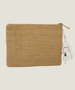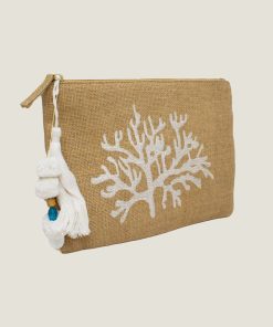 A perfect embroidered clutch bag that is compact and lightweight, composed of natural coloured woven fabric and finished with cotton embroidered coral motif.