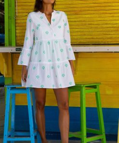Introducing our Cristina Embroidered Kaftan made from soft 100% organic cotton. Featuring a deep v-neckline with mandarin collar, optional button closure and subtle raw edge detailing on cuffs, waist and tier. Finished with flute sleeves, allover floral embroidery and cut to a two-tiered loose swing hem.
