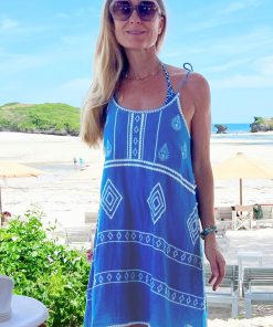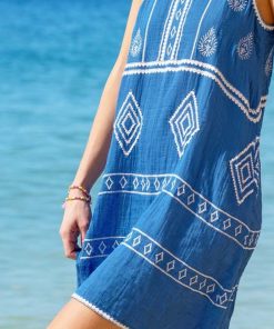 Introducing the Imogen Dress, made from soft single cotton gauze, new this spring/summer. It features a scoop neckline and self-tie spaghetti straps with tab detailing. Beautifully embroidered with statement motifs, trim embroidered details in the perfect above-the-knee length.