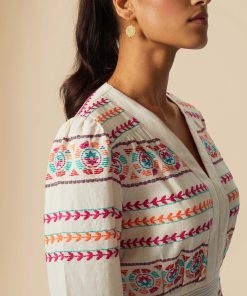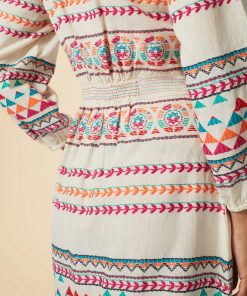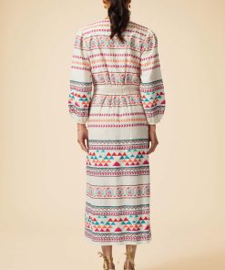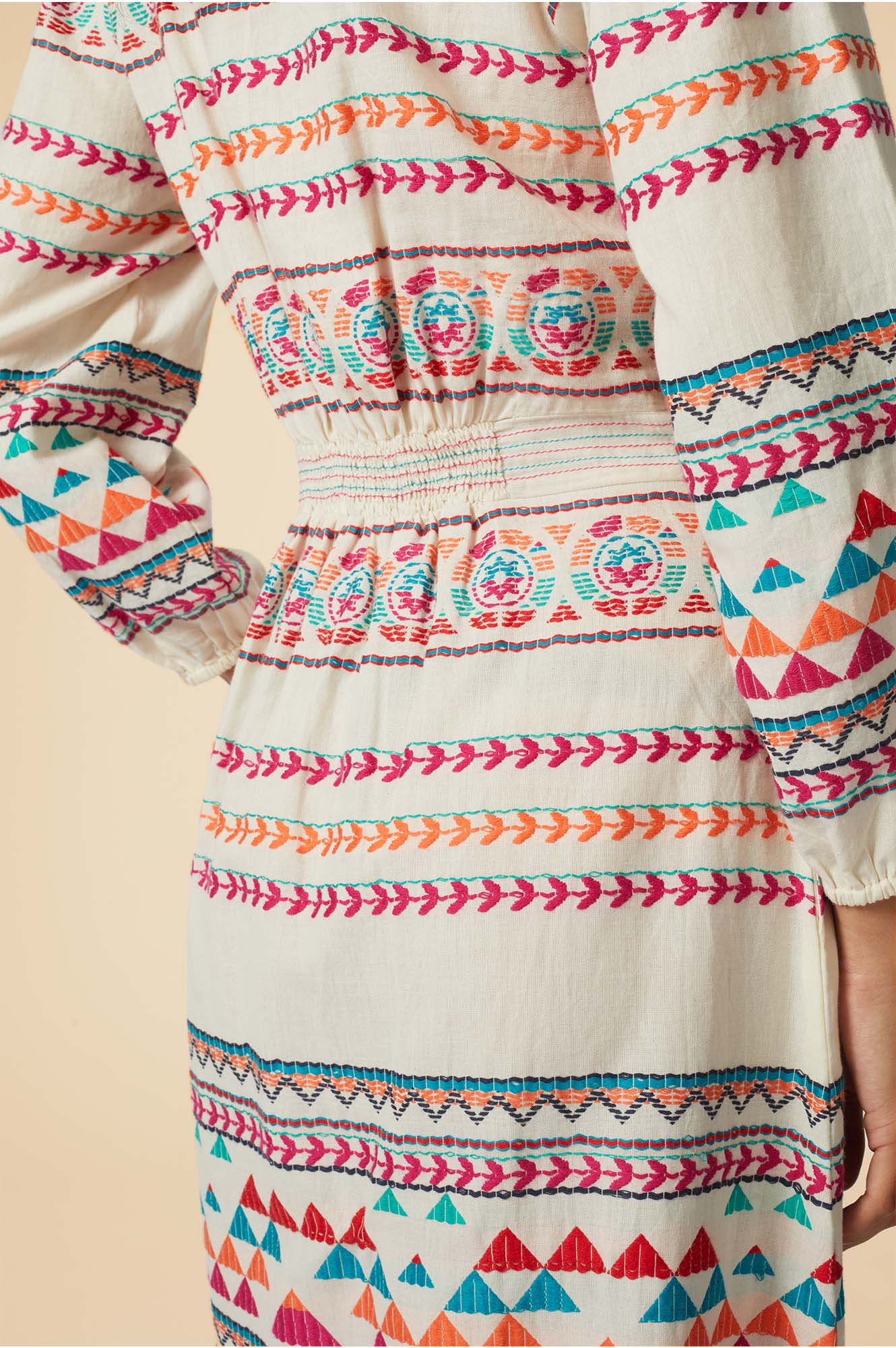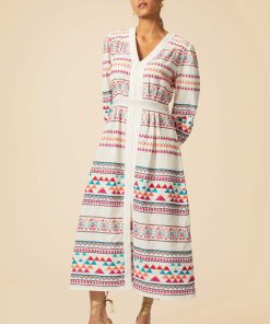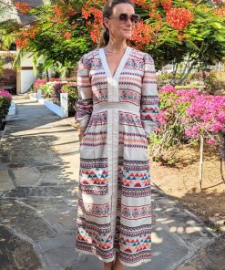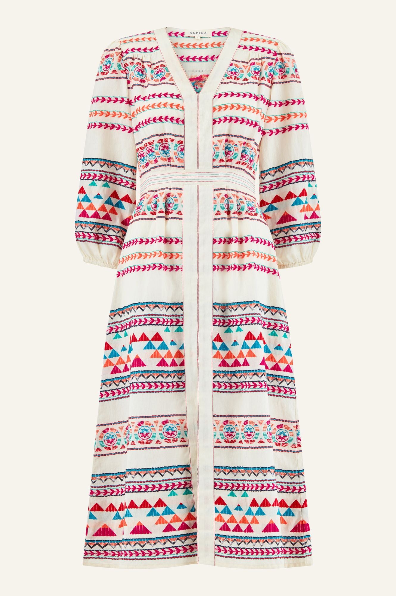 Jamila is made from 100% cotton gauze with a bold multicoloured jacquard design. Bracelet length sleeves, a centre front split and a cinched in waist, makes this an uber feminine midi dress.