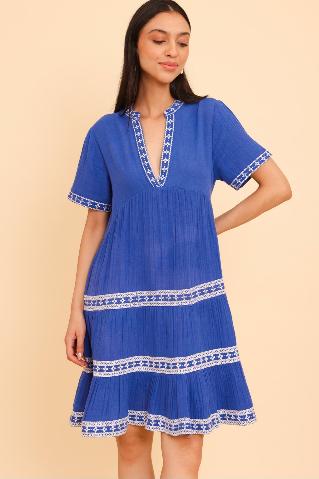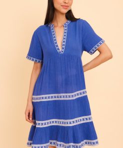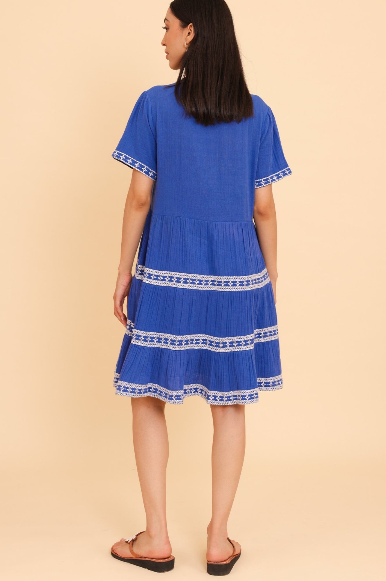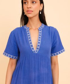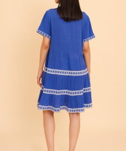 The Meredith Dress makes a return this season, crafted from soft double weave organic cotton. It features a deep V-notch neckline, short sleeves, and a curved empire waistline, creating a flattering swing shape. Designed with two tiers and intricate contrast embroidery at the neckline, cuffs, tiers, and hem, this dress is both stylish and comfortable. It’s finished with side seam pockets and cut to a flattering above-the-knee length for a chic, effortless look.