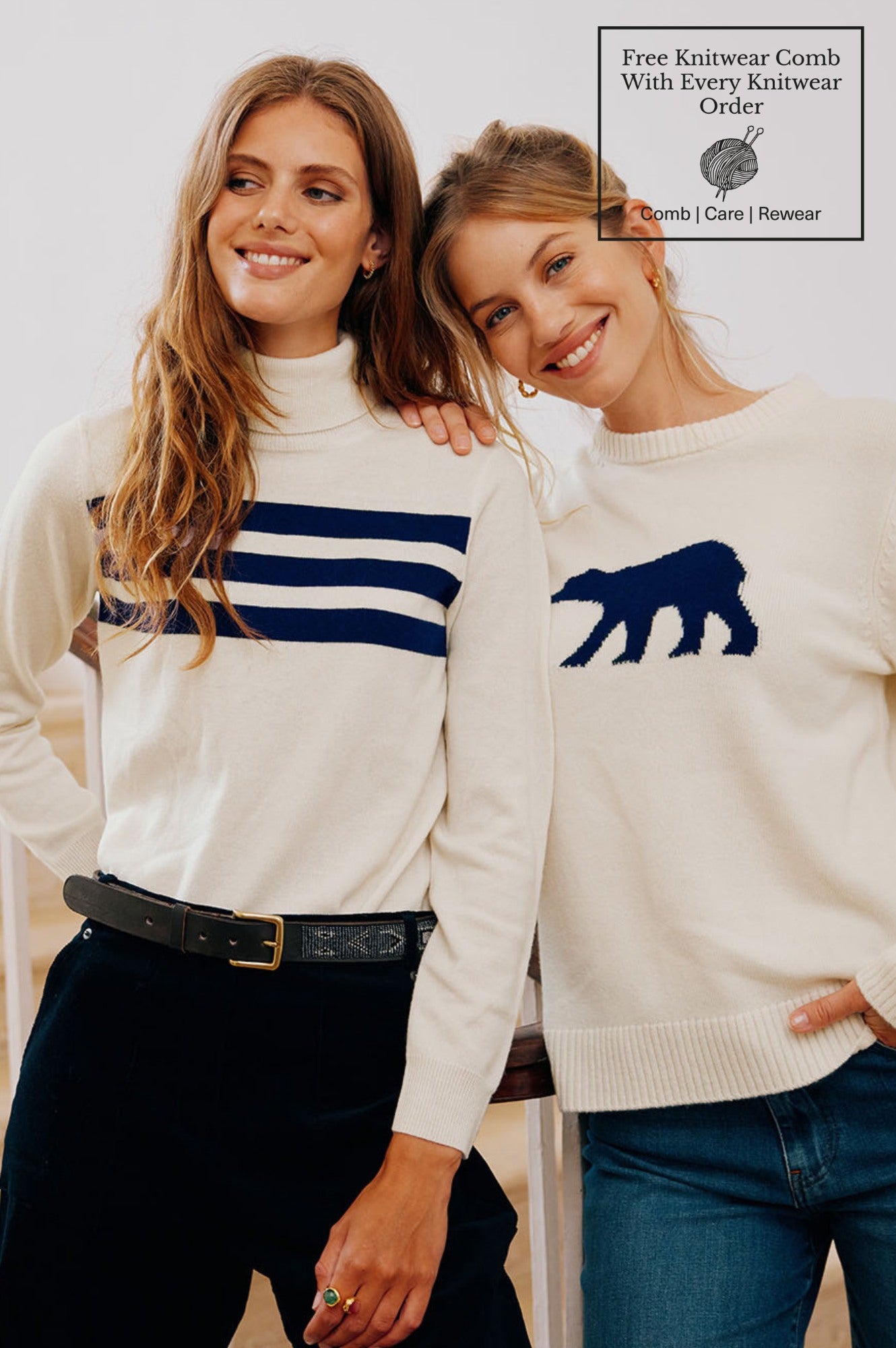 The finest 100% merino wool yarn gives this jumper a cashmere feel. In a lightweight finer knit, this slim-fitting polo neck is perfect for layering. With a high neck, ribbed hem and cuffs. More colourways available. Half price knitwear comb with every purchase – discount applied at checkout when you add one to your basket.