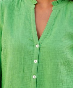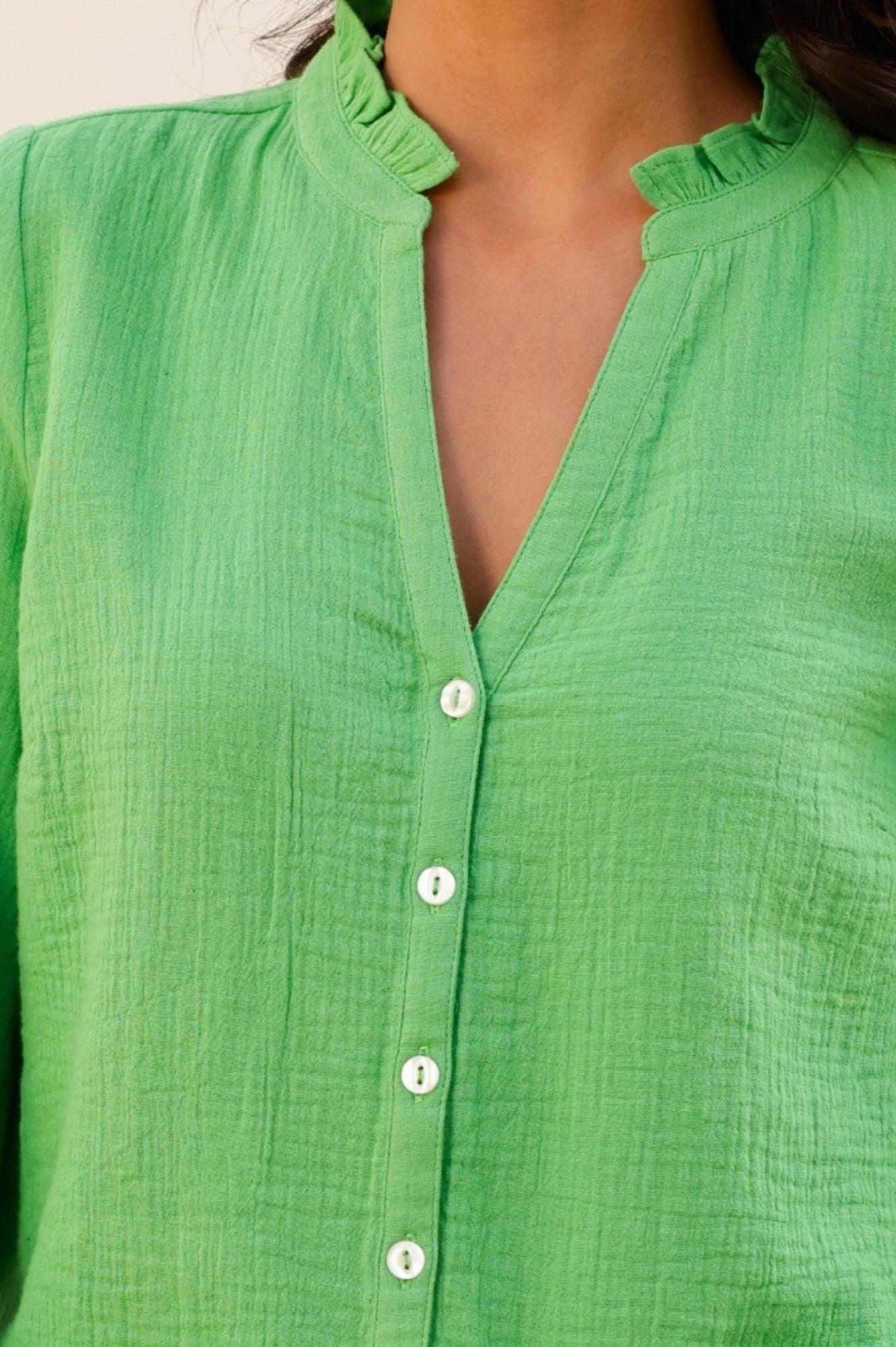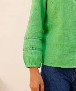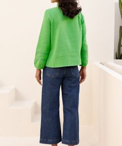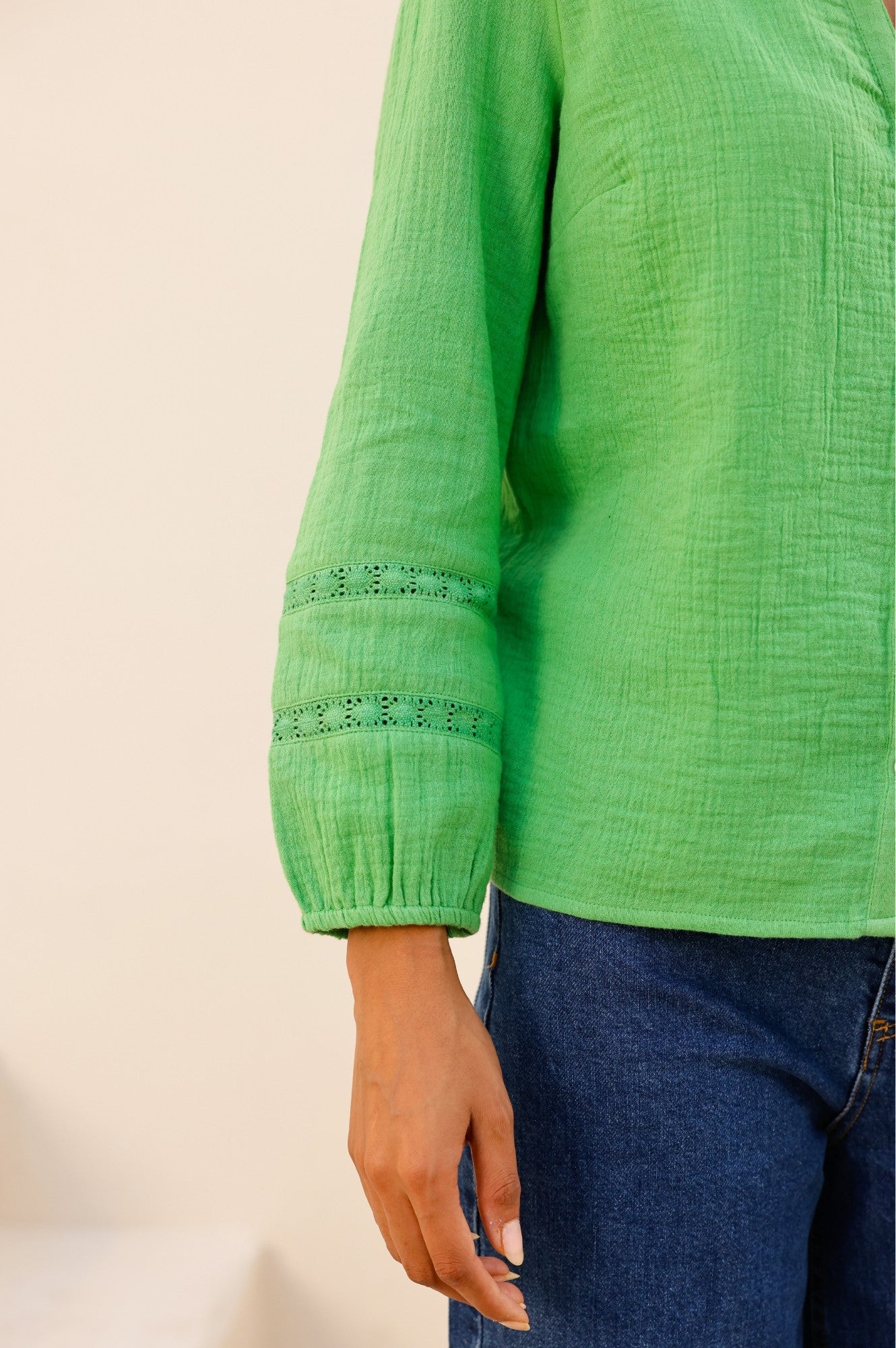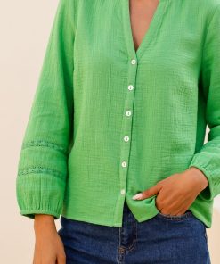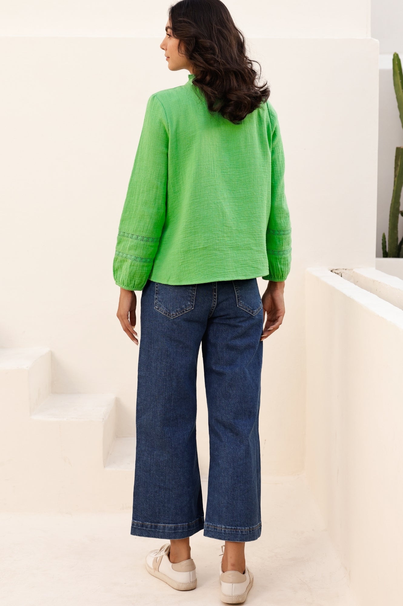 Say ‘hello’ to the Mina blouse. It is crafted from 100% organic cheesecloth for a light, breathable feel that’s perfect for warmer days. Featuring soft bracelet length sleeves and a relaxed fit, it drapes beautifully for a naturally flattering silhouette. The delicate lace trim adds a touch of feminine charm, making it easy to dress up or down. It pairs well with jeans for a casual look or layered over a skirt for a more polished appearance.