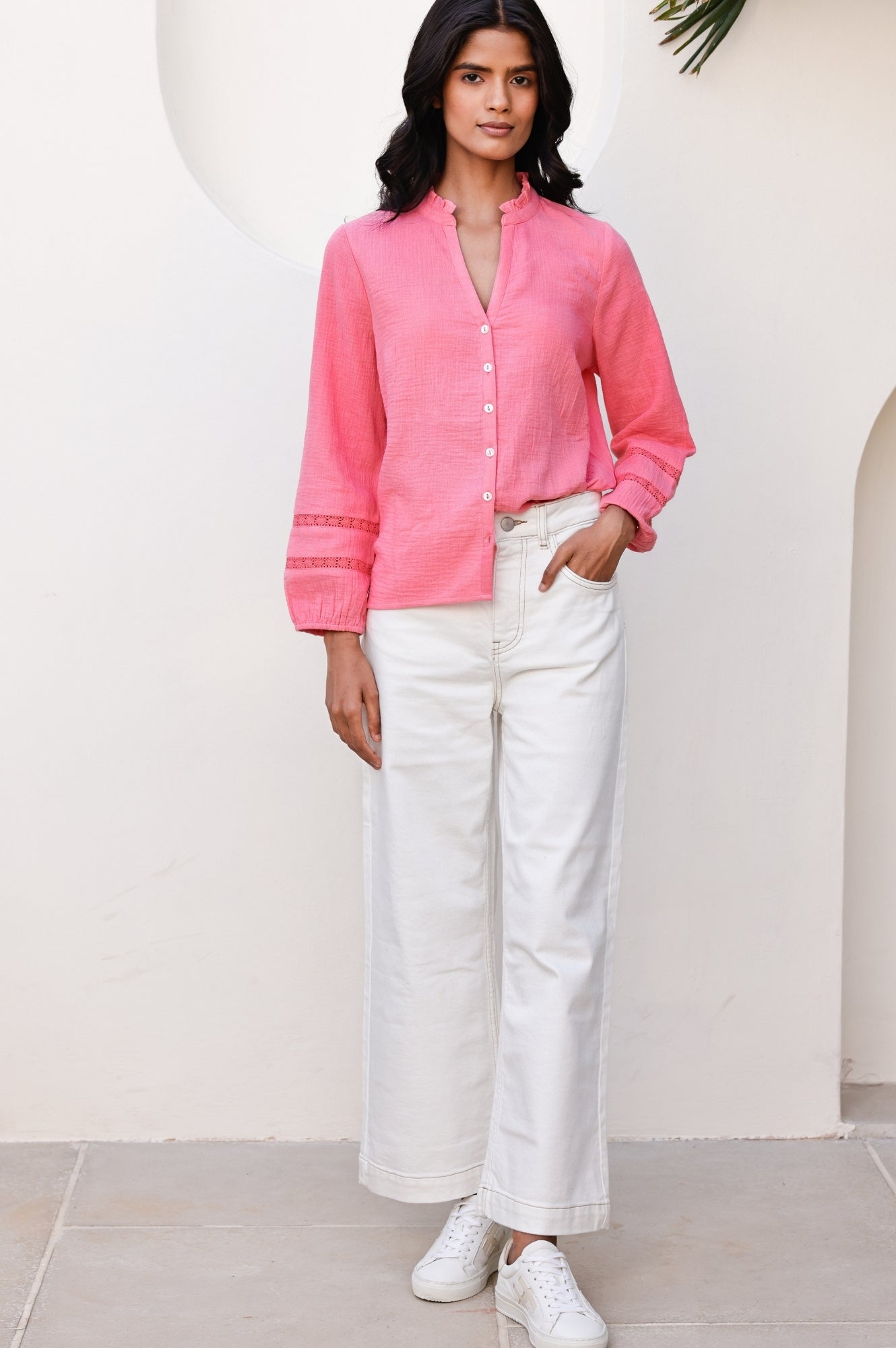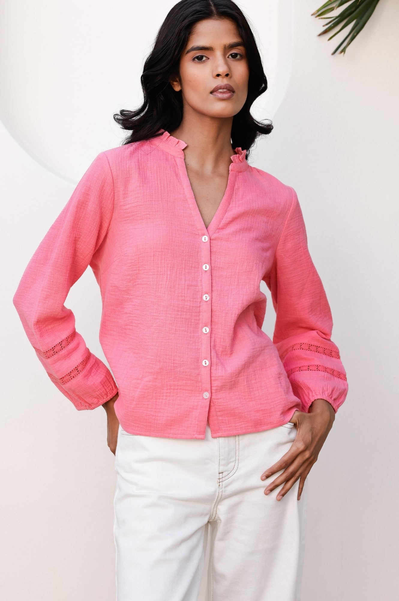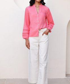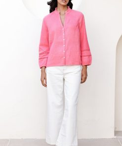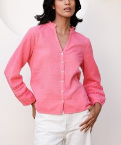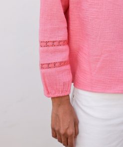 Say ‘hello’ to the Mina blouse. It is crafted from 100% organic cheesecloth for a light, breathable feel that’s perfect for warmer days. Featuring soft bracelet length sleeves and a relaxed fit, it drapes beautifully for a naturally flattering silhouette. The delicate lace trim adds a touch of feminine charm, making it easy to dress up or down. It pairs well with jeans for a casual look or layered over a skirt for a more polished appearance.
