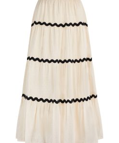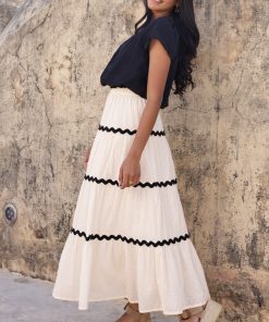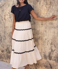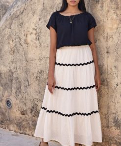 This elegant tiered maxi skirt is crafted from a lightweight cotton dobby which has a soft, breezy feel. The design features contrasting black ric-rac trim across the tiers, adding a touch of charm and bold definition. With its elasticated waistband for a comfortable fit, this skirt is perfect for effortless summer styling, whether paired with a simple blouse or a casual tee.