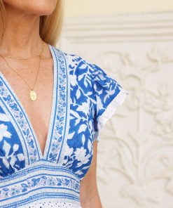 Hand block printed in Jaipur and made from 100% organic cotton, the Pippa is the ultimate summer occasion dress. The cinched-in waist is elasticated for comfort while giving an uber-feminine silhouette, combined with a plunging neckline and cap sleeves with pretty Broderie Anglaise lace trim.