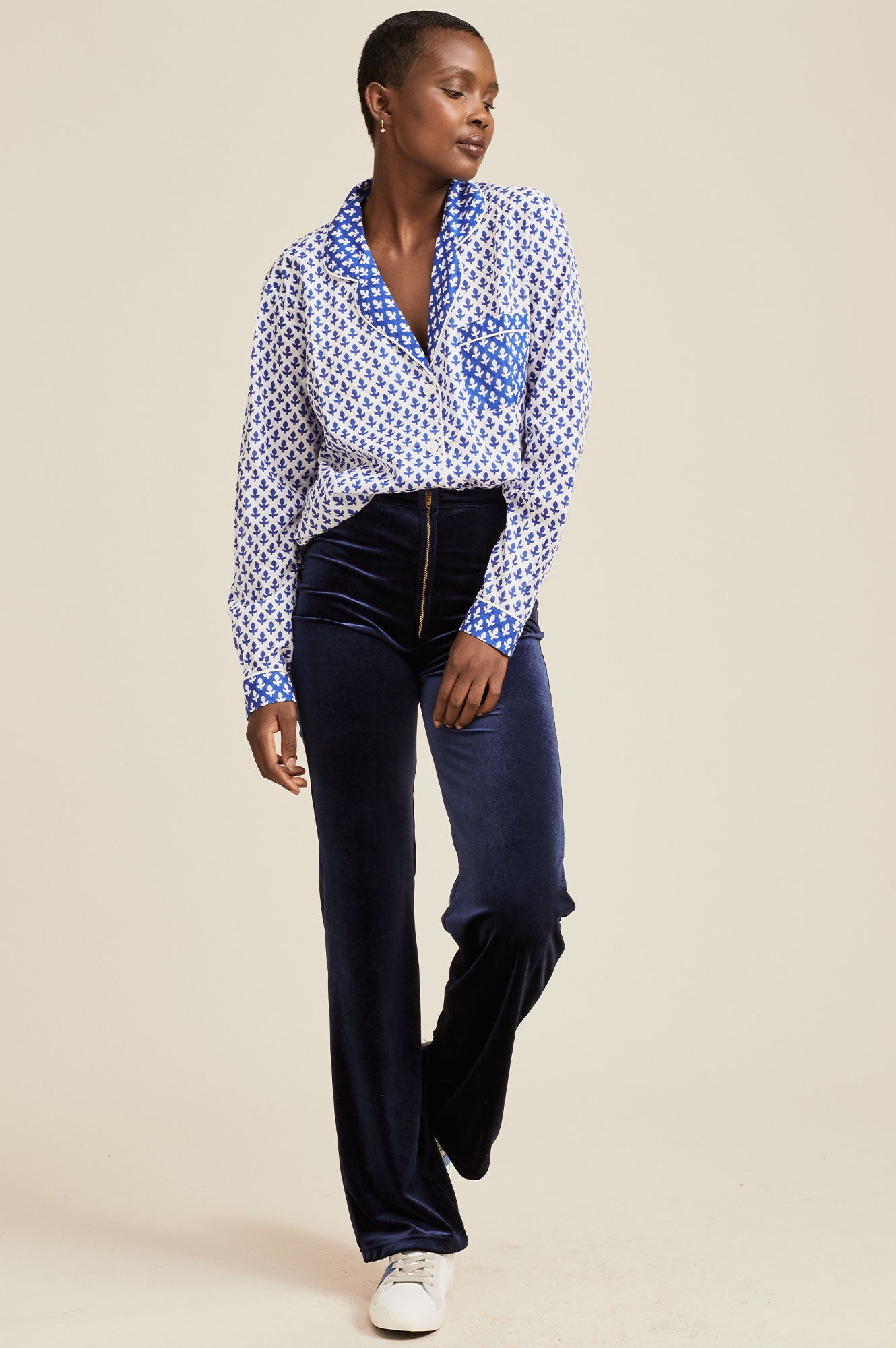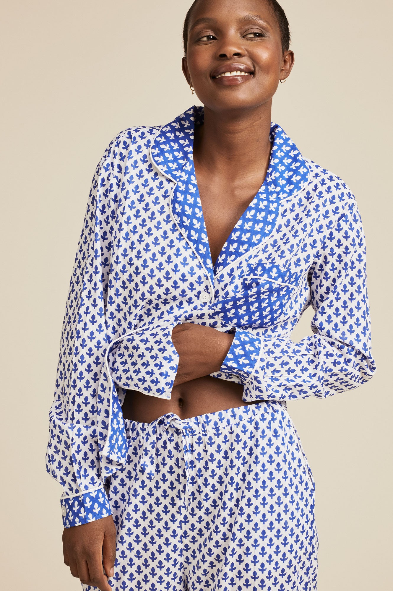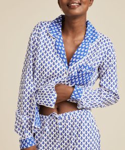 Introducing our lightweight and breathable Pyjama Set is made from soft organic cotton, in a classic button-down design with piping detail. Featuring a contrasting print on the collar, front pocket and cuffs. Paired with the full-length matching bottoms with an elasticated, drawstring waistband and concealed side pockets.