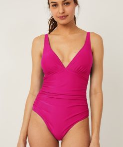Crafted from 82% recycled nylon and 18% elastane, our Ruched Swimsuit is perfect for your next getaway. Be sure to pack the V-Neck Ruched Swimsuit its features a plunging v-neck with padding, soft molded cups and adjustable straps, this style is made in double-layered fabric for a premium finish. The set-in side seams, lightweight control panel and ruching provide a flattering silhouette for all figures.