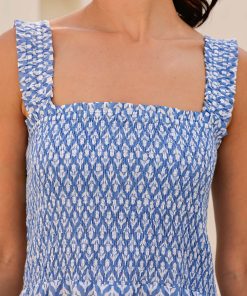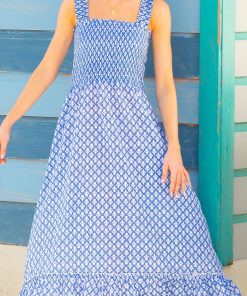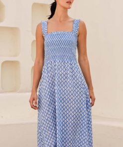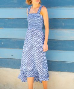 Our Rhianna dress made from printed soft organic cotton. Featuring a square neckline, shirred elasticated bodice and straps with frill detailing. Finished with a single-tier with a midi length dipped hem design.