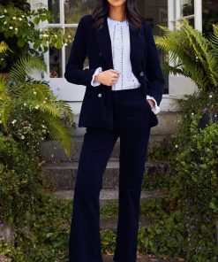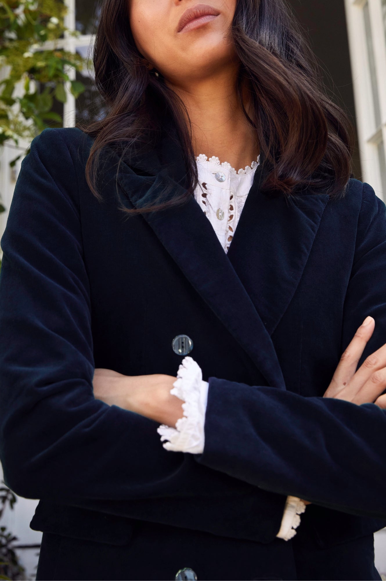 Introducing our Theresa Corduroy Blazer, made from organic cotton stretch corduroy. This classic double-breasted blazer features two front flap pockets.