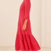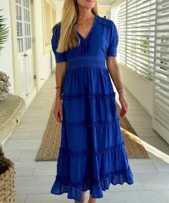 The Viola dress is crafted from soft organic cotton dobby, offering both comfort and style. It features a flattering V-neckline and short sleeves with deep lace cuffs for a touch of elegance. The waistband is adorned with inserted lace at the front, while the back is shirred for a comfortable, figure-enhancing fit. With its tiered design, the dress also includes raw-edge frill details at the neckline and along the tier seams, adding a playful, textured finish.