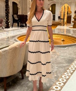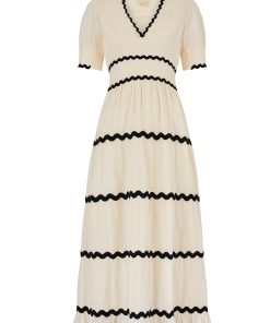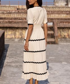 The Viola dress is made from soft organic cotton dobby, offering both comfort and style. It features a flattering V-neckline and short sleeves, accented with black ric rac at the cuffs, waist, tiers, and neckline. The back waistband is shirred for a comfortable, figure-enhancing fit, and the tiered design adds a stylish touch.